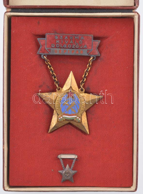 Leírás: ~1950. "Szakma kiváló dolgozója - Gépipar" Rákosi-címeres zománcozott kitüntetés hátoldalán "1465" sorszámmal, miniatűrrel, eredeti dombornyomott tokban T:XF kis zománchiba, patina, kopott tok