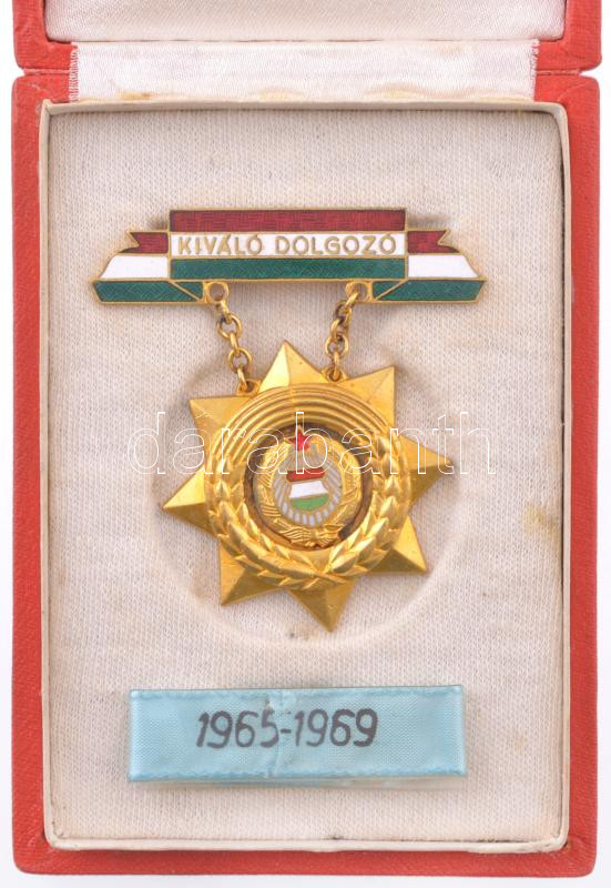 ~1969. "Kiváló Dolgozó" aranyozott, zománcozott, műgyantás j... https://www.darabanth.com/hu/448-Gyorsarveres/448.0/Numizmatika/Falerisztika-Kituntetesek-jelvenyek~500018/7E1969-Kivalo-Dolgozo-aranyozott-zomancozott-mugyantas-jelveny-tokban-TAU~II2964872