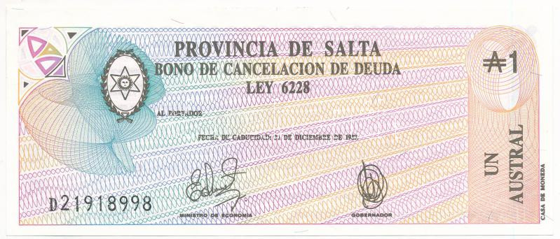 Argentina / Salta 1987. 1 Austral local banknote C:AU