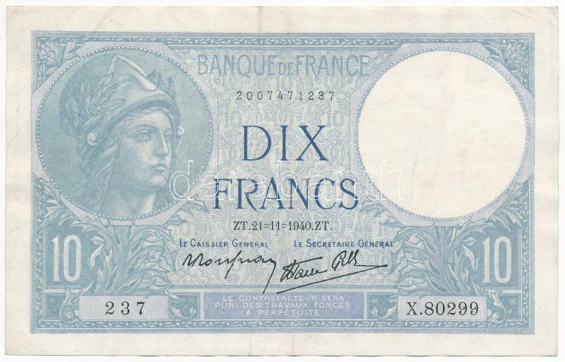 France 1940. 10 Francs C:F fi... https://www.darabanth.com/hu/448-Gyorsarveres/448.0/Numizmatika/Kulfoldi-bankjegyek~500013/Franciaorszag-1940-10Fr-TF-szep-papir-France-1940-10-Francs-CF-fine-paper~II2966347