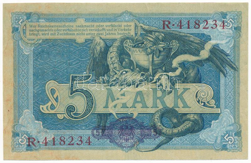 Leírás: Német Birodalom 1904. 5M hat számjegyű sorszám T:AU