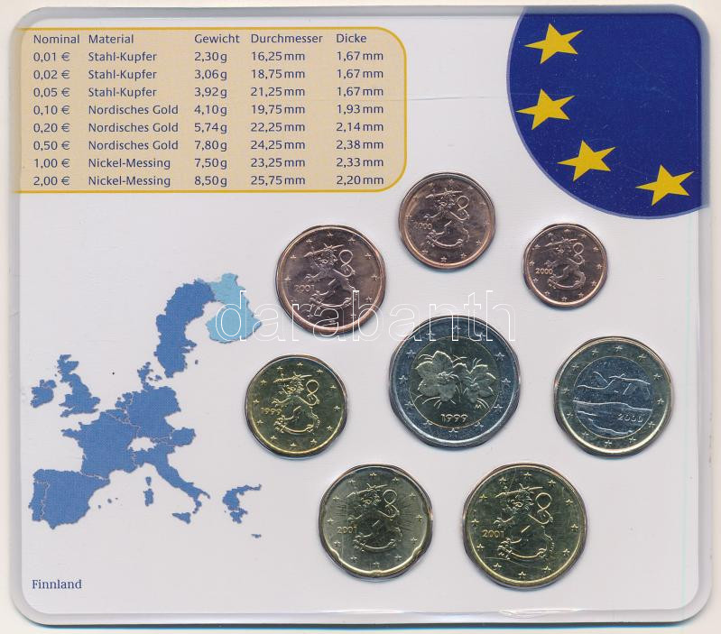 Finland 1999-2001. 1 Cent - 2 Euro (8xdiff) coin set in closed plastic display sheet C:UNC,AU