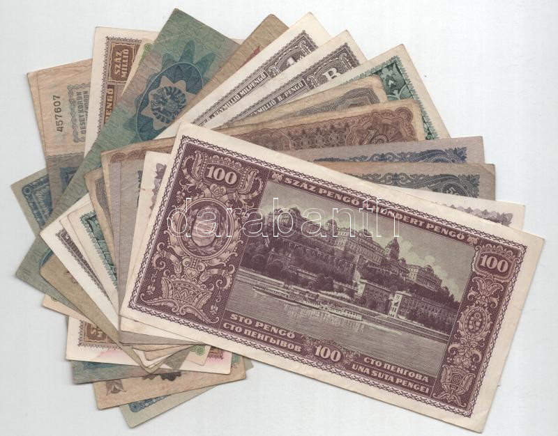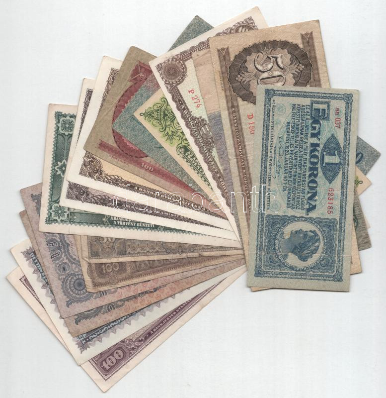 16db-os magyar bankjegytétel, közte 1913. 20K + 1920. 50K "Orell Füssli" + 1920. 100K "Orell Füssli" + 1945. 500P (2x) az egyiken magyar "N" betű orosz "P" helyett + 1949. 100Ft T:F,VG közte szép papír