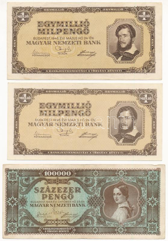 1946. 100.000P + 1.000.000MP (2x) T:AU,F Adamo P31 https://www.darabanth.com/hu/448-Gyorsarveres/448.0/Numizmatika/Magyar-bankjegyek~500007/1946-100000P-plus-1000000MP-2x-TAU-F-Adamo-P31~II2967719