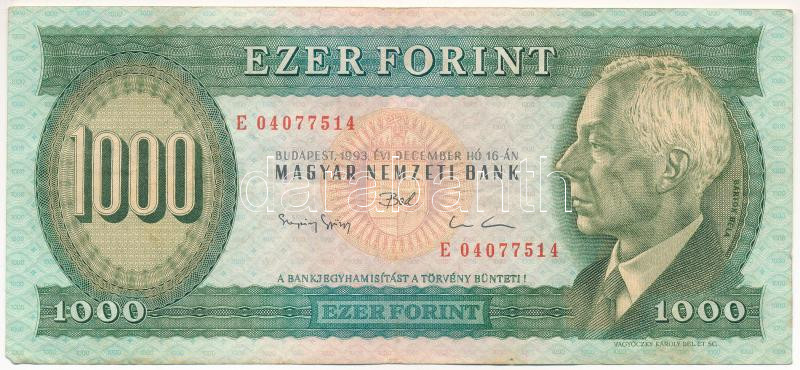 1993. 1000Ft "E 04077514" T:F https://www.darabanth.com/hu/448-Gyorsarveres/448.0/Numizmatika/Magyar-bankjegyek~500007/1993-1000Ft-E-04077514-TF~II2975363