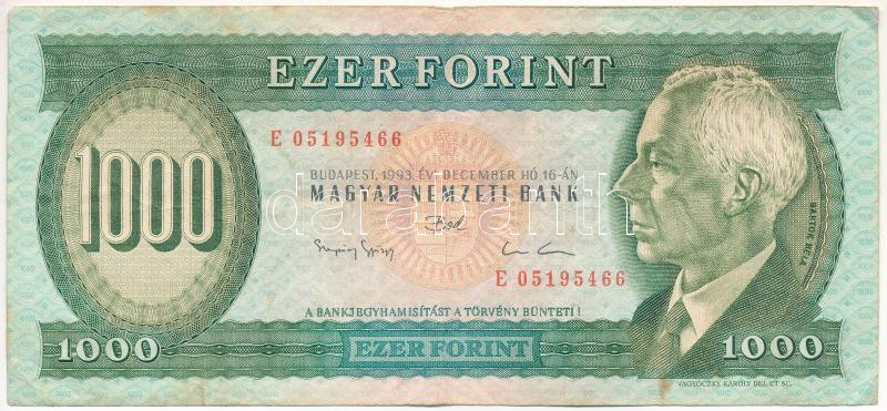 1993. 1000Ft "E 05195466" T:F https://www.darabanth.com/hu/448-Gyorsarveres/448.0/Numizmatika/Magyar-bankjegyek~500007/1993-1000Ft-E-05195466-TF~II2975383
