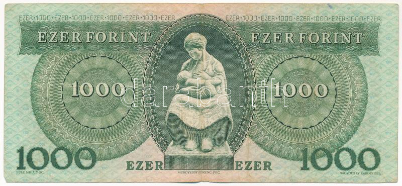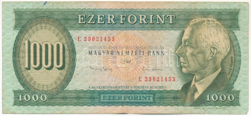 1993. 1000Ft "E 23021453" T:F,VG folt https://www.darabanth.com/hu/448-Gyorsarveres/448.0/Numizmatika/Magyar-bankjegyek~500007/1993-1000Ft-E-23021453-TF-VG-folt~II2910726