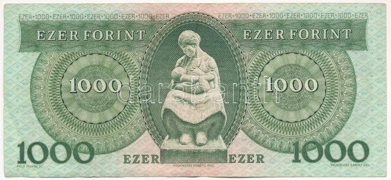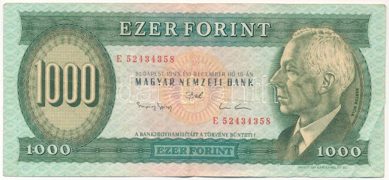 1993. 1000Ft "E 52434358" T:F kis folt https://www.darabanth.com/hu/448-Gyorsarveres/448.0/Numizmatika/Magyar-bankjegyek~500007/1993-1000Ft-E-52434358-TF-kis-folt~II2910728