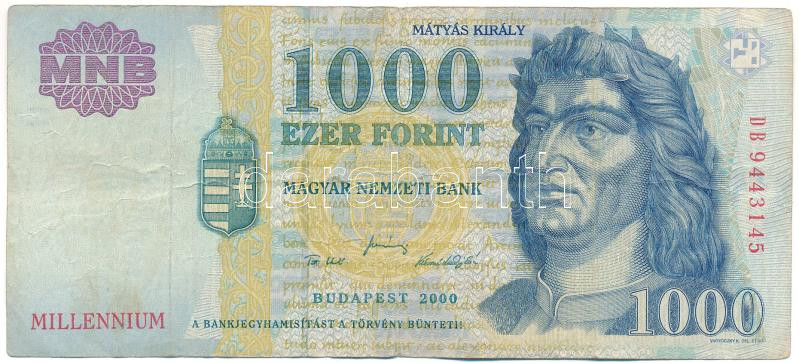 2000. 1000Ft "Millennium", "DB" betűjel T:F https://www.darabanth.com/hu/448-Gyorsarveres/448.0/Numizmatika/Magyar-bankjegyek~500007/2000-1000Ft-Millennium-DB-betujel-TF~II2975965