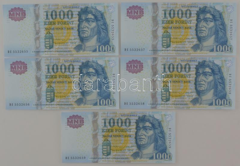 2015. 1000Ft (5x) sorszámkövetők "DE 5532655 - DE 5532659" T... https://www.darabanth.com/hu/448-Gyorsarveres/448.0/Numizmatika/Magyar-bankjegyek~500007/2015-1000Ft-5x-sorszamkovetok-DE-5532655-DE-5532659-TUNC-AU~II2969634