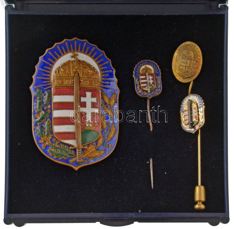 1920. "Vitézi Jelvény" zománcozott bronz jelvény, bronz kard rátéttel, hátlapon ferde rögzítőpántokkal, hátlapon "Jerouschek Bpest Semmelweis u. 7." gyártói jelzéssel (57x37mm) + 3db jelzetlen miniatűr: 1db zománcozás nélküli, 1db zománcozott, hátlapon forrasztásnyommal, 1db modern zománcozott T:XF,AU zománchibák Hungary 1920. "Badge of the Order of Vitéz" enamelled bronze badge, with bronze sword overlay, with oblique bands on the back, with "Jerouschek Bpest Semmelweis u. 7." maker's mark on the back (57x37mm) + 3pcs of miniatures without makers mark: one without enamel, one with enamel, with soldering mark on the back, one enamelled modern pc C:XF,AU enamel errors NMK 334.