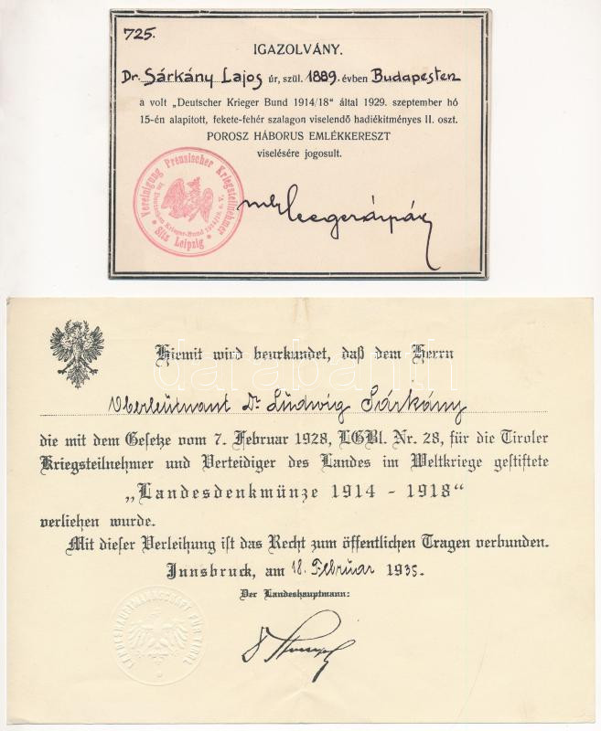 Austria 1934-1935. Certifiates of commemorative war medals for Lajos Sárkány, with certificates of the following decorations: "Medal for the Defense of Tyrol", "Great War Commemorative Medal", "Prussian War Honor Cross with swords"