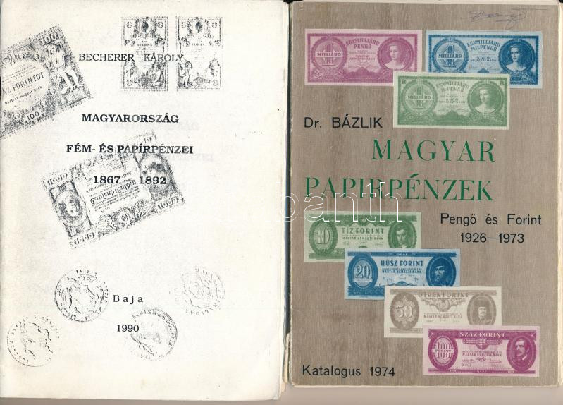 4db-os numizmatikai irodalom tétel, közte Tower Hugó: I. Ferenc József fémpénzei 1848-1916. Budapest, 1926/1929. + Dr. Bázlik László György: Magyar Papírpénzek - Pengő és Forint 1926-1973. Katalógus. Budapest 1974. + Becherer Károly: Magyarország fém- és papírpénzei 1867-1892. Baja, MÉE Bajai Csoportja, 1990. tűzött, fénymásolt változat + Tasnádi Géza: Érték és ritkaságjelzés. Magyar papírpénzek 1848-1992. Budapest 1995. fénymásolt változat. Használt állapotban.