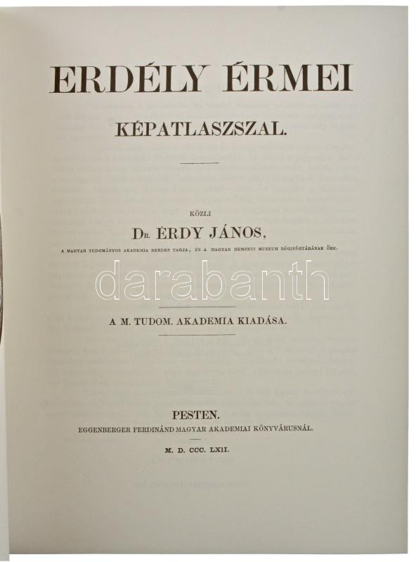 Érdy János: Erdély érmei képatlasszal. Bp., 2010., Magyar Mercurius. Az 1862-ben megjelent kiadás hasonmása. Ebből a könyvből 850 számozott példány készült. Kiadói papírkötésben. Számozott (279/850.) példány. Új állapotban.
