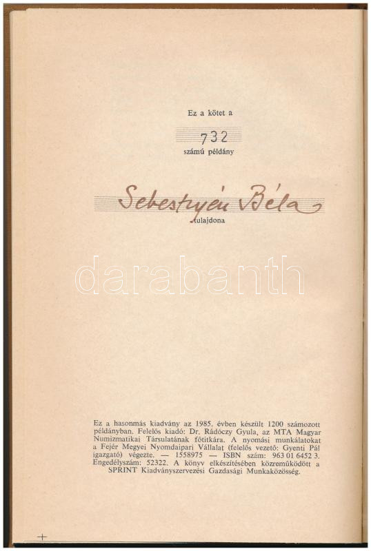 Luczenbacher János: A' szerb zsupánok, királyok , és czárok pénzei. Budán, a' Magy. Kir. Egyetem' betüivel. Hasonmás kiadvány, 1985. Névre szóló, számozott, "732." sorszámú példány. Használt, jó állapotban.