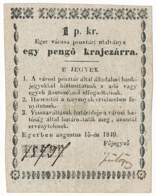 Hungary / Eger 1849. 1 Krajczár necessity note (notgeld) hand signed, with "15737" serial number C:F tape mark on the back
