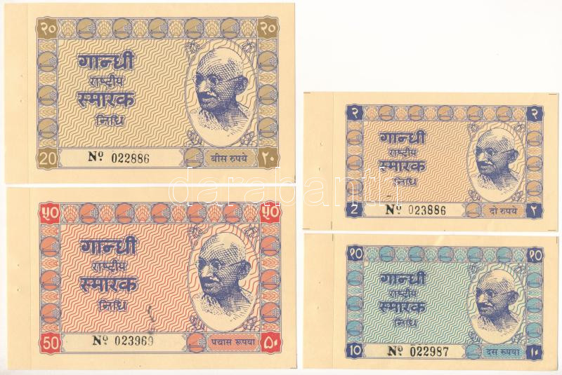 India ~1948-1949. 2R + 10R + 20R + 50R (4xklf) A "Mahatma Gandhi National Memorial Trust" által 1949-ben rendezett első nyilvános adománygyűjtés adakozási bizonylatai T:AU tűzőgép ly., az egyiken kis folt