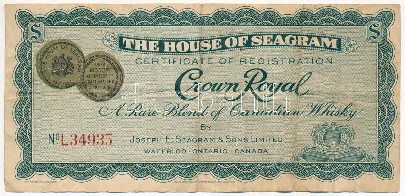 Kanada ~1960. "The House of Seagram - Crown Royal kanadai whisky" igazolás. A kanadai bankjegynyomdában készült (Canadian Bank Note Company Limited) T:F