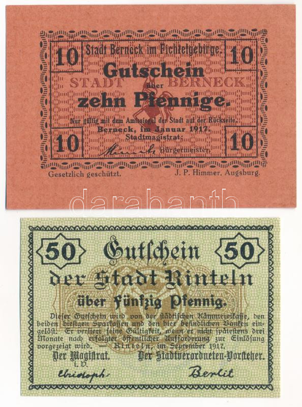 German Empire / Rinteln 1917. 10 Pfennig + Berneck im Fichtgebirge 1917. 10 Pfennig, both with stamp C:AU