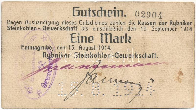 German Empire / Coal Labor Union of Rybnik (Rybniker Steinkohlen-Gewerkschaft) 1914. 1 Mark with stamp and perforation C:F