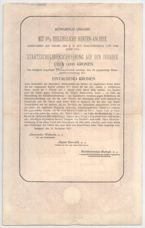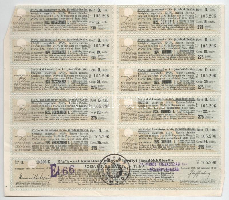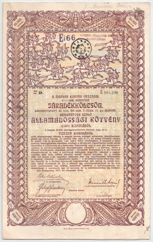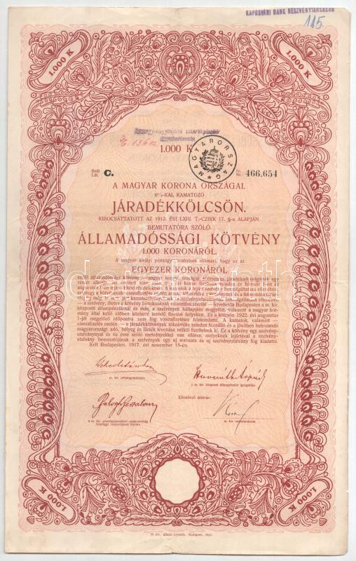 Budapest 1917. "A Magyar Korona Országai 6%-kal kamatozó Járadékkölcsön" bemutatóra szóló államadóssági kötvénye 1000K-ról szárazpecséttel, bélyegzéssel + "A Magyar Korona Országai 5 1/2%-kal kamatozó Járadékkölcsön" bemutatóra szóló államadóssági kötvénye 10.000K-ról szárazpecséttel, bélyegzéssel, szelvényekkel T:F kis ly.