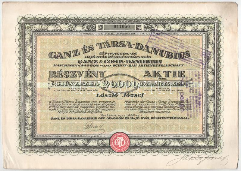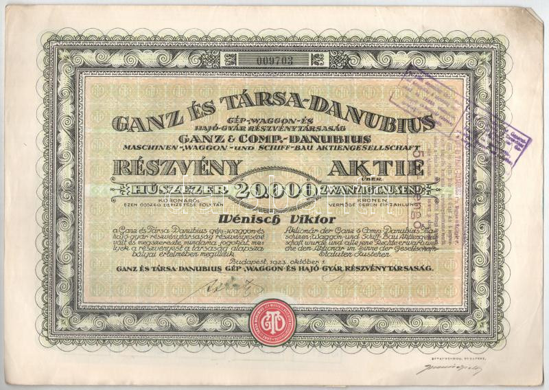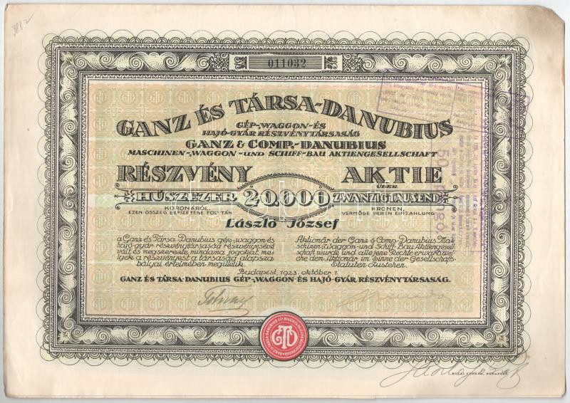 Budapest 1923. "Ganz és Társa- Danubius Gép-, Waggon- és Hajó-Gyár Részvénytársaság" részvénye 20.000K-ról, magyar és német nyelven, szárazpecséttel, bélyegzésekkel és szelvényekkel (3x) T:XF-F