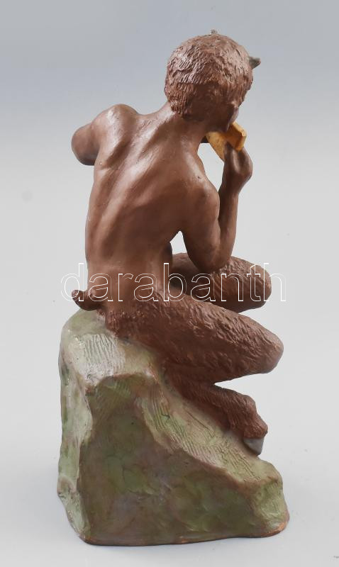 Leírás: Izsépy Margit: Furulyázó Faun. Festett kerámia, jelzéssel, kis kopással, m: 28,5 cm