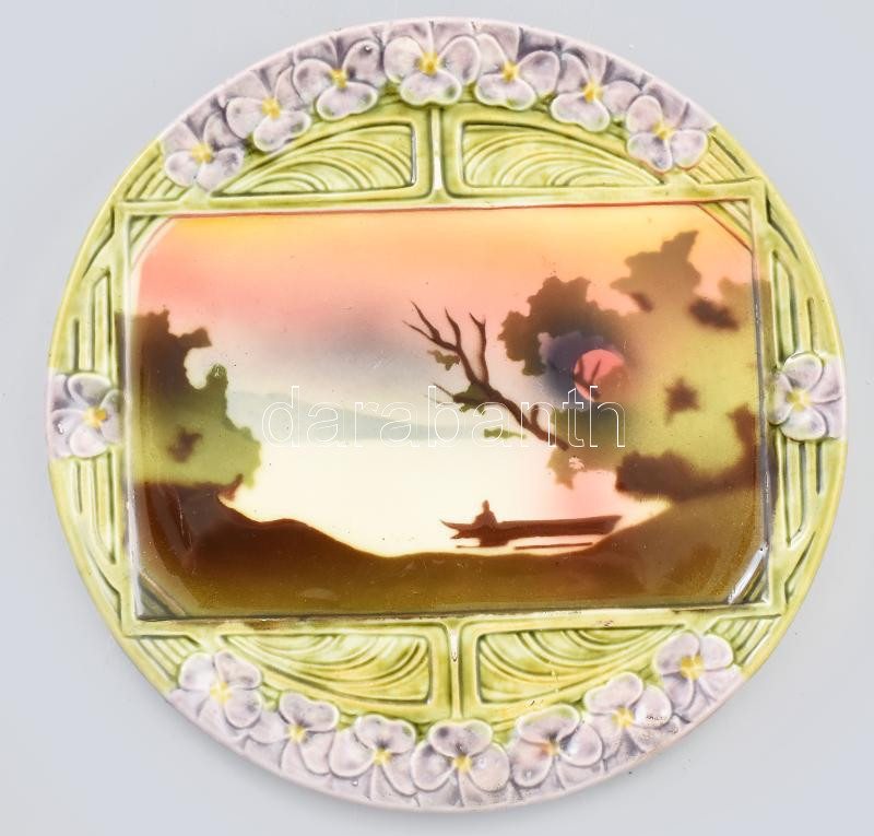 Leírás: Körmöcbánya szecessziós tóparti táj mintás falitányér. Mázas fajansz, kis kopással, szép állapotban, jelzéssel, d: 17,5 cm