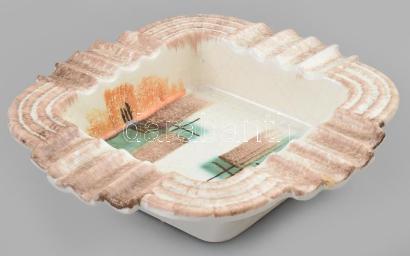 Leírás: cca 1920-1930 Steingutfabrik Elsterwerda korai art deco mázas fajansz hamutál, kis pattanásokkal, jelzéssel, 18x18 cm