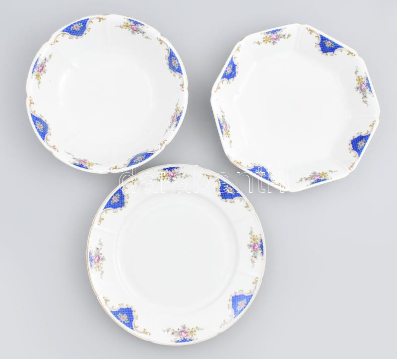 Leírás: 3 darab antik csehszlovák kínálótál, matricás, jelzéssel, kopott, d: 27-30 cm