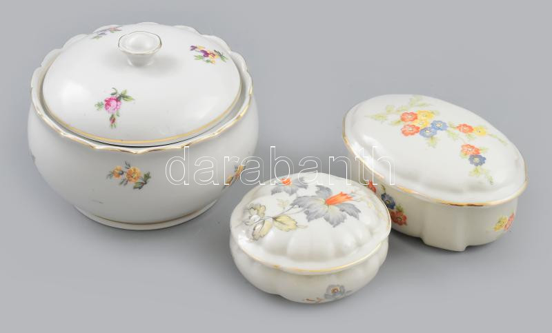 Leírás: 3 darab virágmintás bonbonier: Oscar Schlegelmilch, Hollóháza, jelzéssel, hibátlan, d: 8-12 cm