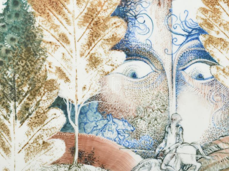 Franyó Tóth István Ferenc (1954- ): Lord of the rings - Gyűrűk ura Herendi porcelánra festett kép. Kézzel festett, jelzett, hibátlan 19x32 cm Aranyozott, szövet betétes fa keretben