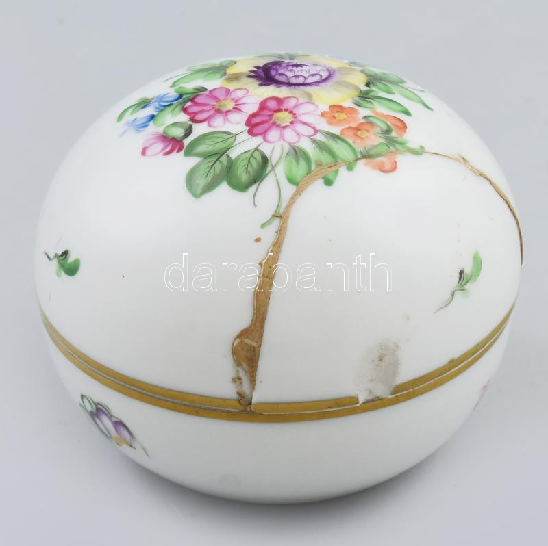 Leírás: Herendi bonbonier, kézzel festett, teteje ragasztott, jelzéssel, d: 7,5 cm
