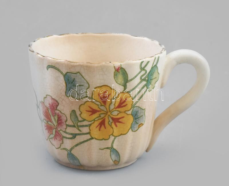 Leírás: Régi virágmintás fajansz csésze. Matricás, jelzett, kopásokkal, mázrepedésekkel, m: 5 cm, d: 5,5 cm