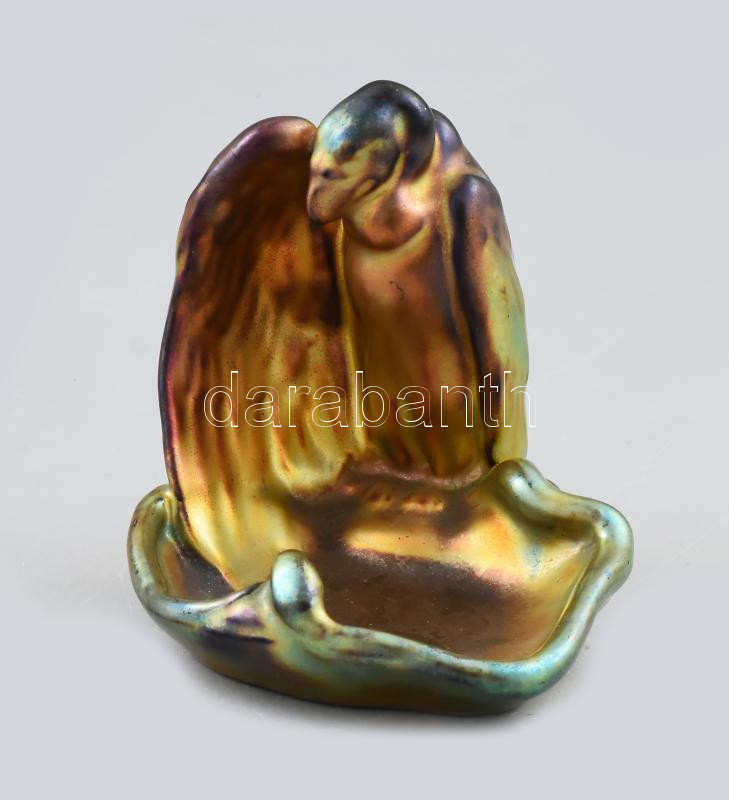 Leírás: Zsolnay eozin mázas keselyű ékszertartó, kis mázkopással, pajzspecsétes, m: 7,5 cm