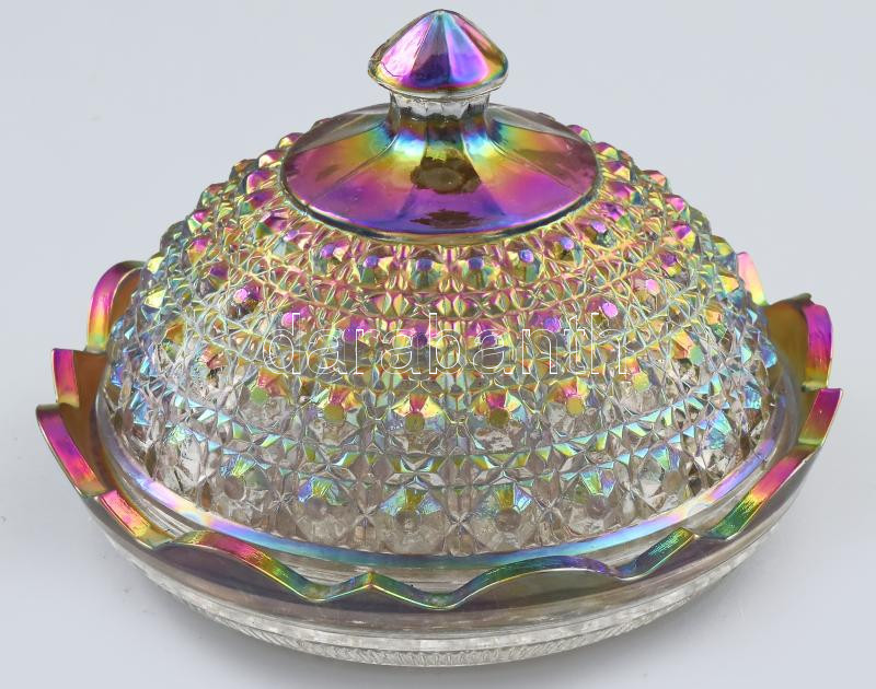 Antik irizáló karneválüveg vajtartó, formába préselt, jelzés nélkül, m... https://www.darabanth.com/hu/448-Gyorsarveres/448.0/Porcelan-keramia-uveg/Uvegtargyak~1000007/Antik-irizalo-karnevaluveg-vajtarto-formaba-preselt-jelzes-nelkul-minimalis-kopottsag~II2974888