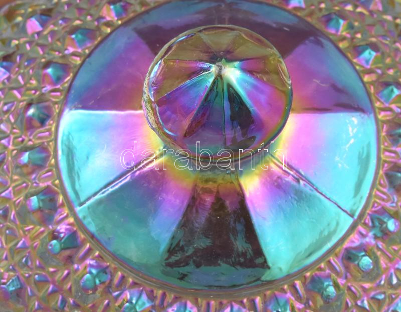 Leírás: Antik irizáló karneválüveg vajtartó, formába préselt, jelzés nélkül, minimális kopottsággal, d: 17 cm, m: 12 cm