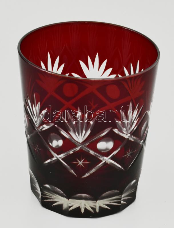 Leírás: Dúsan csiszolt kristály vörös whiskey pohár, 6 db, original dobozban, hibátlan, m: 9,5 cm
