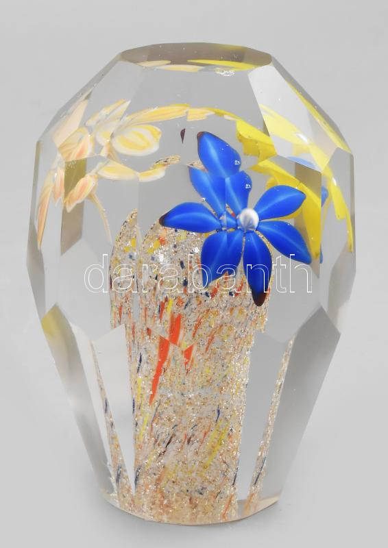 Leírás: Murano levélnehezék, tömör, belső színezett üveg virág díszítéssel, lapra csiszolt, jelzés nélkül, kis kopással, m: 10,5 cm