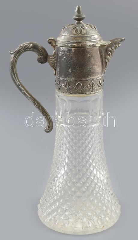 Leírás: Szecessziós stílusú üveg kancsó kiöntő, ezüstözött fém szerelékkel, kopással, m: 30 cm