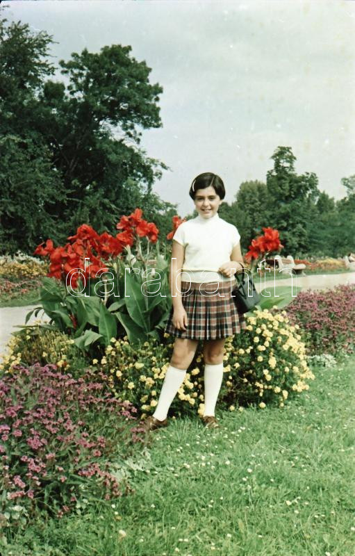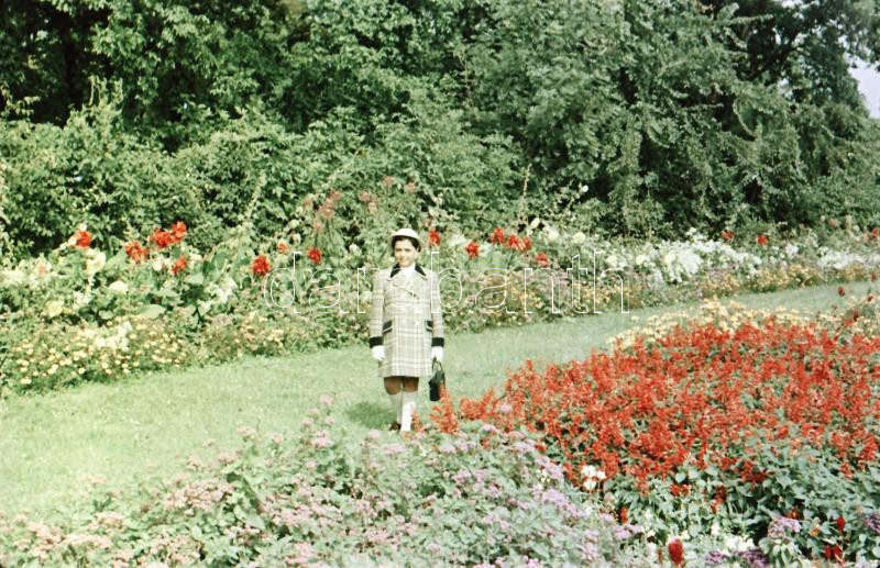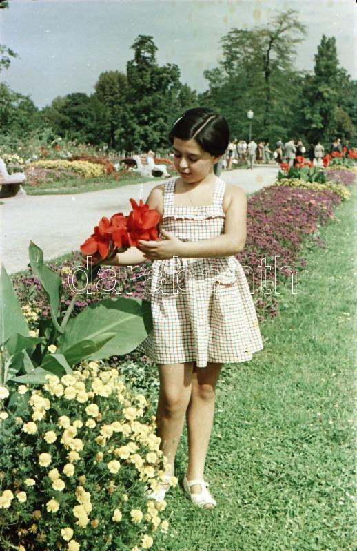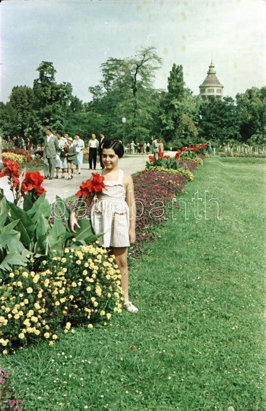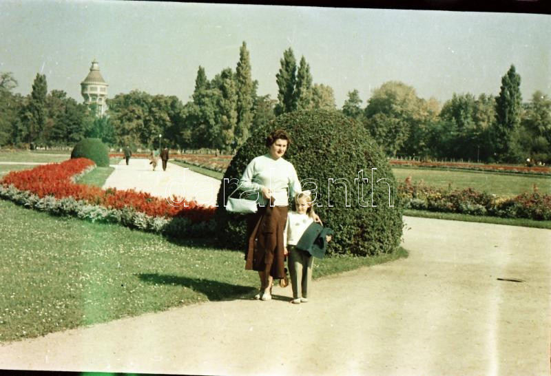 1956 Budapest, a Margitsziget színes felvételeken, a képek elősorban családi emlékképek, de a korabeli környezet (növényzet) is tanulmányozható a felvételeken, szerzője ismeretlen, a negatívok szabadon felhasználhatók, 26 db vintage színes NEGATÍV, 24x36 mm