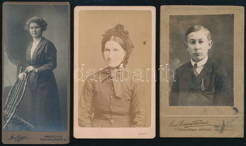 cca 1890-1917 3 db keményhátú vizitkártya: Idős hölgy portréja, Heller József budapesti műterméből + Fiatal fiú portréja, Özv. Bienenfeld Zsigmondné városligeti műterméből (a hátoldalon a műterem képével) + Hölgy bambusz székkel, Max Jäger Krems an der Donau-i műterméből. 10,5x6,5 cm körüli méretben.