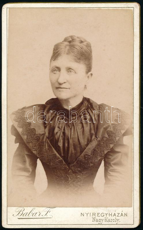 cca 1890 Női portré, keményhátú fotó Babar Ferenc (Nyíregyháza / Nagyv... https://www.darabanth.com/hu/449-Gyorsarveres/449.0/Fotomuveszet/Foto~500023/cca-1890-Noi-portre-kemenyhatu-foto-Babar-Ferenc-Nyiregyhaza-Nagyvarad-mutermebol-~II2979526