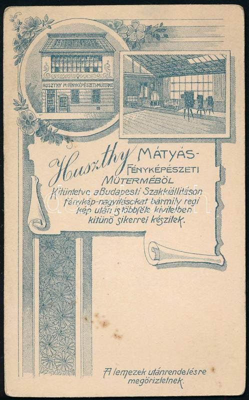 Leírás: cca 1910 Férfiportré, keményhátú fotó Huszthy Mátyás (Hajdúszoboszló / Nagybánya) műterméből, hátoldalon a műterem képével, 10,5×6,5 cm