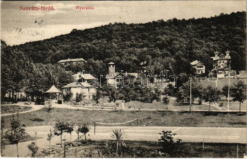 Leírás: 1913 Szovátafürdő, Sovata-bai; nyaralók, teniszpálya. Schuster Emil kiadása / villas, tennis court (fa)
