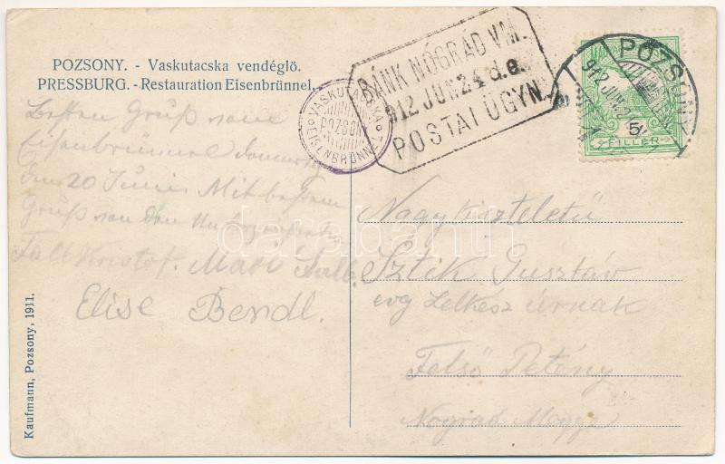 Leírás: 1912 Pozsony, Pressburg, Bratislava; Vaskutacska vendéglő, terasz, pavilon, pincérek. Kaufmann kiadása / Restauration Eisenbrünnel / restaurant with waitres, teras, pavilion + "BÁNK NÓGRÁD VM. POSTAI ÜGYN." (EK)