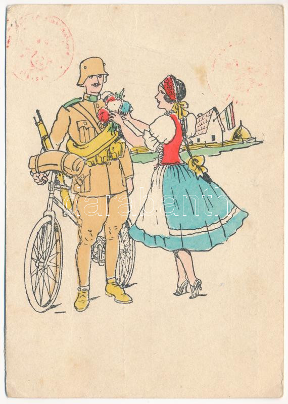 1943 Bevonulás. Kiadja a Délvidéki Egyetemi és Főiskolai Hallgatók Egyesülete / WWII Hungarian military art postcard, entry of the Hungarian troops, folk customes, irredenta propaganda + tábori posta (gyűrődések / creases)