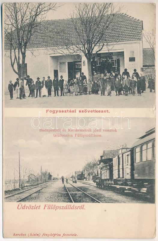 Leírás: 1910 Fülöpszállás (Kiskunság), Fogyasztási szövetkezet üzlete, Budapestről és Kecskemétről jövő vonatok találkozása a vasútállomáson. Kerekes (Klein) fényképész felvétele (EK)