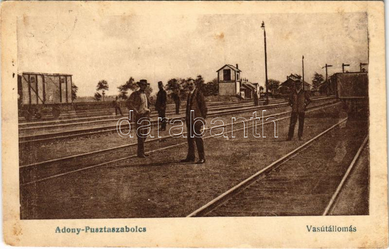 1918 Adony-Pusztaszabolcs, vasútállomás, vagonok. Vasúti levelezlapárú... https://www.darabanth.com/hu/449-Gyorsarveres/449.0/Kepeslapok/Magyarorszag~1000006/1918-Adony-Pusztaszabolcs-vasutallomas-vagonok-Vasuti-levelezlaparusitas-7902-fl~II2979937
