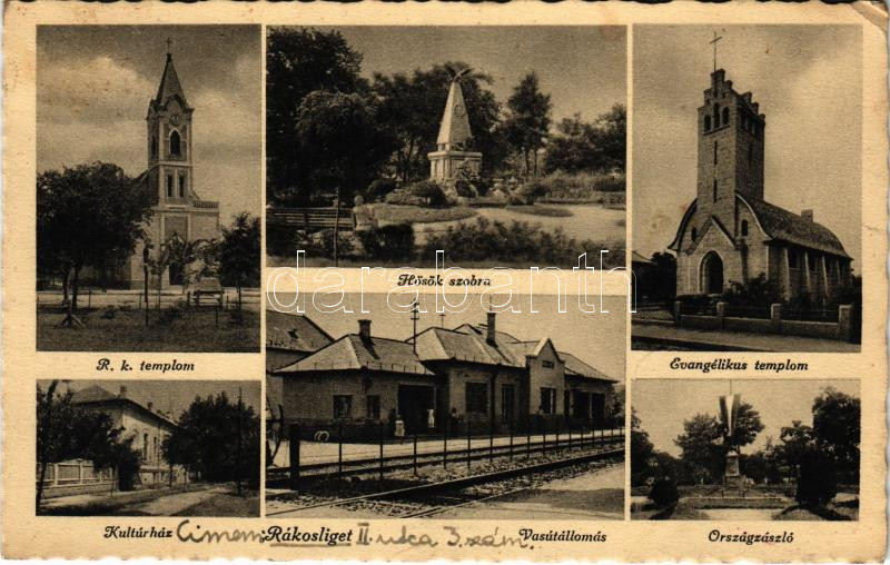 Leírás: 1940 Budapest XVII. Rákosliget, Római katolikus és evangélikus tmeplom, Hősök szobra, Kultúrház, országzászló, vasútállomás (EK)
